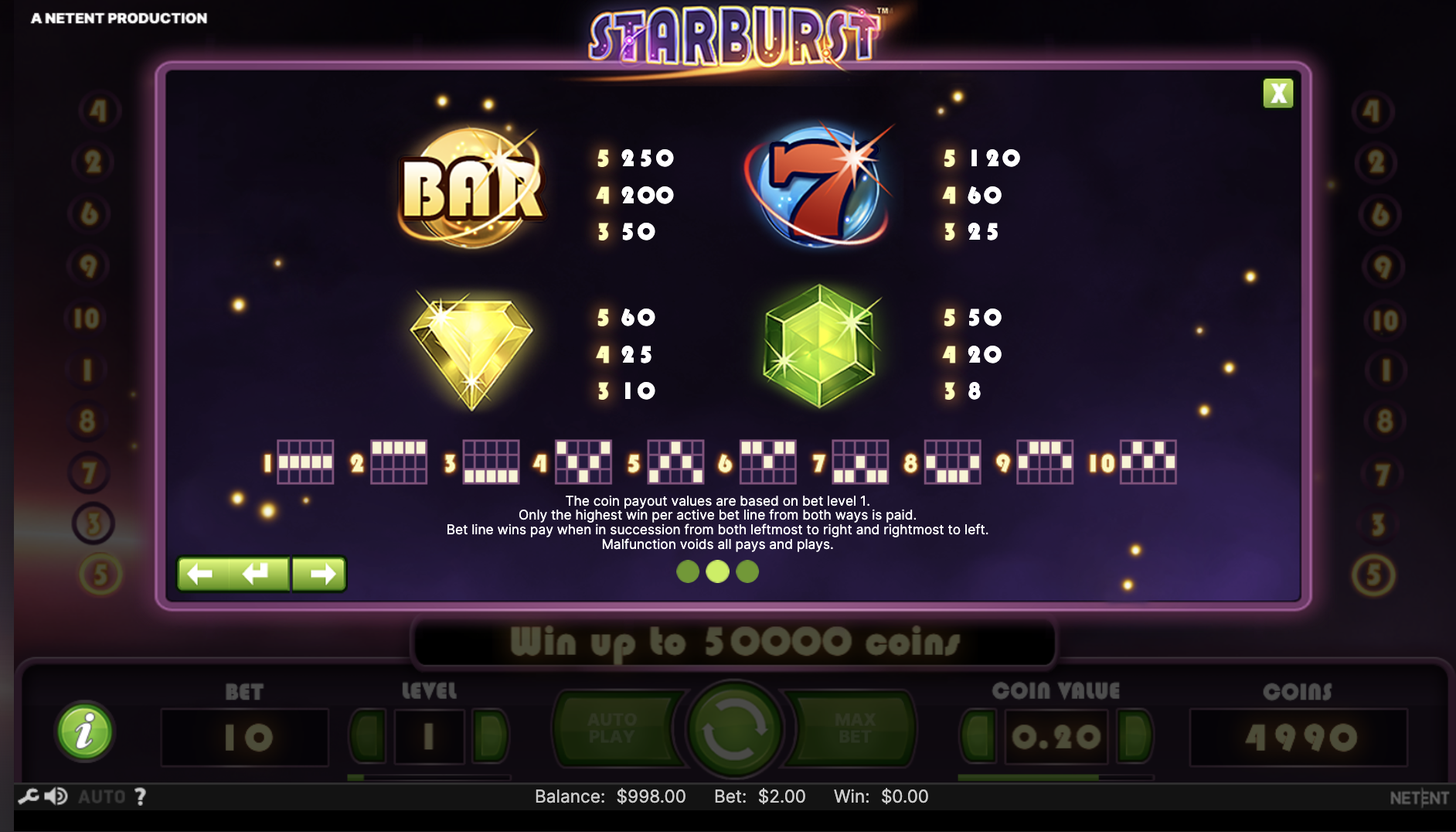Λάβετε υπόψη ότι το Starburst πληρώνει και με τους δύο τρόπους. Δεν θα κερδίσετε 250 φορές την επένδυσή σας γεμίζοντας τους τροχούς με σφαιρικά σύμβολα BAR. Από αριστερά προς τα δεξιά και από δεξιά προς τα αριστερά, μια οθόνη γεμάτη με σύμβολα Bar κερδίζει 500 x το ποντάρισμα.